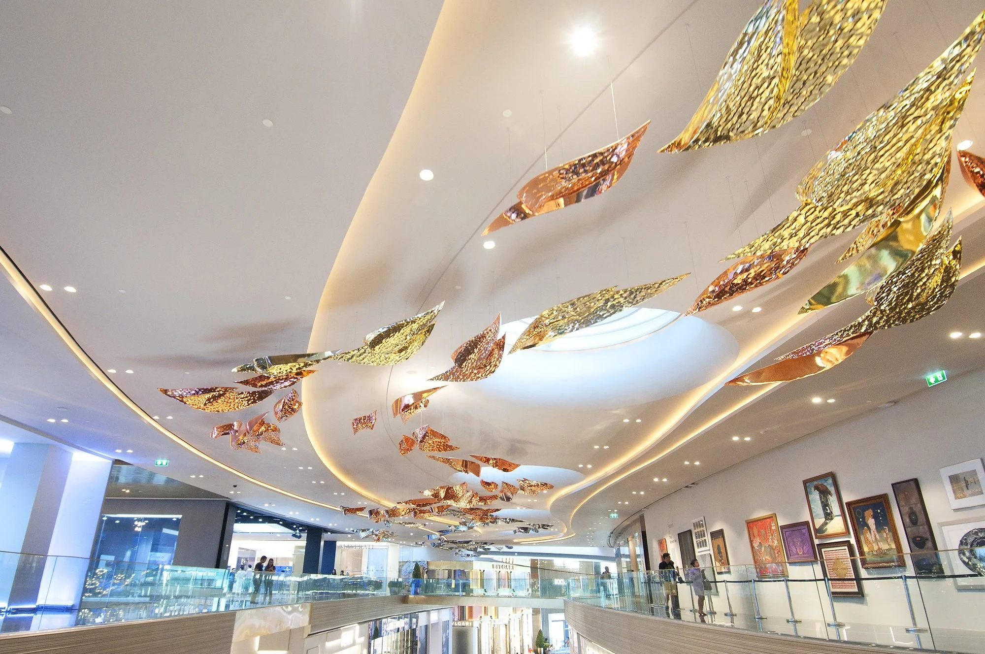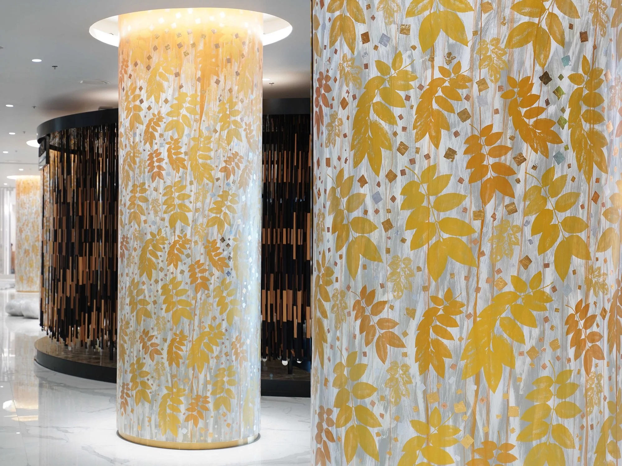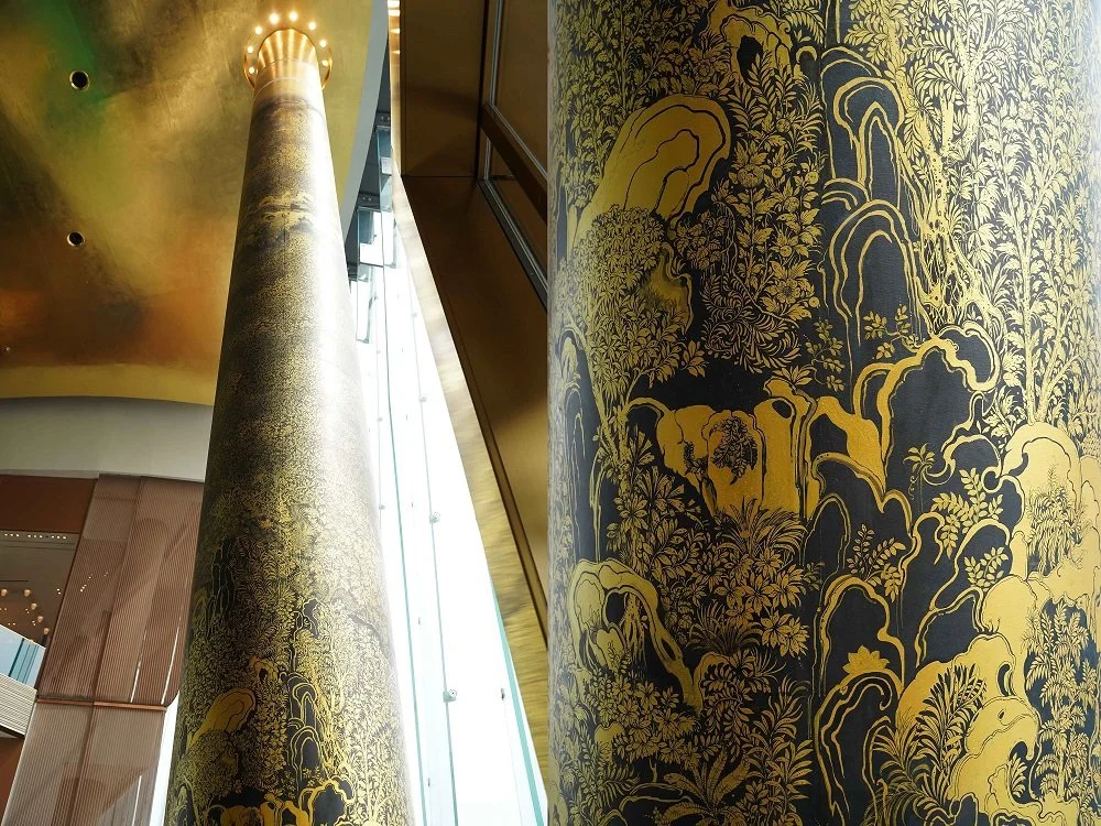 สำหรับเส้นทางสายอาร์ตต่อมาที่รอให้ทุกคนมาสำรวจ ได้ตกแต่งอย่างสวยงามเป็นสง่าที่ชั้น M และ 1 ของไอคอนสยาม กับ “เสาแห่งมงคล” ทองอร่ามทั้ง 8 ต้น สร้างสรรค์โดยศาสตราจารย์ถาวร โกอุดมวิทย์ ศิลปินไทยที่มีชื่อเสียงระดับนานาชาติ เชี่ยวชาญในสาขาภาพพิมพ์ โดยเส้นลวดลายต่างๆ เกิดจากการประทับพิมพ์ใบไม้จากต้นไม้มงคลของไทย ไม่ว่าจะเป็น ใบจากต้นประดู่ และต้นคูณ โดยเส้นสายสีทองบนเสาที่สะท้อนแสงสุกสกาว ซ่อนนัยยะความหมายระหว่าง “ธรรมะ” กับ “ธรรมชาติ” ได้อย่างลึกซึ้ง สามารถสะกดสายตาให้ผู้คนที่เดินผ่านมาหยุดชื่นชมได้อย่างน่าจดจำทีเดียว
