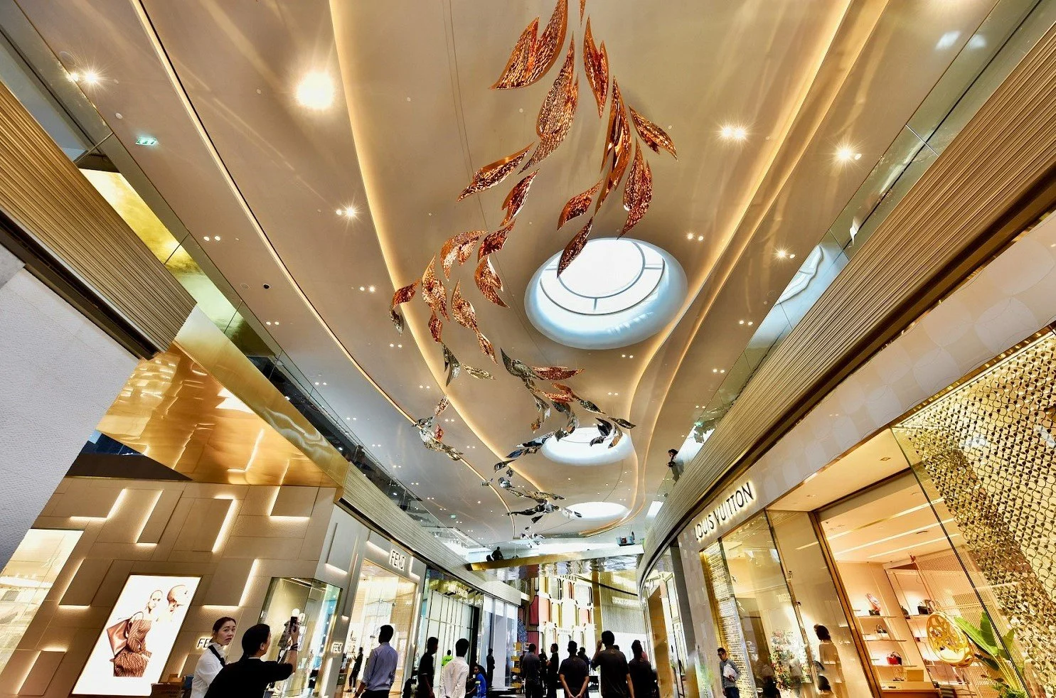 เมื่อเดินถัดมาจากจุดแรกอีกเล็กน้อยในโซน ICONLUXE หากเรามองขึ้นไปด้านบน จะสามารถพบกับงานประติมากรรมขนาดใหญ่สุดอลังการ ที่ Haberdashery Studio อาร์ตสตูดิโอระดับโลกจากประเทศอังกฤษ ได้รังสรรค์ขึ้นจากเส้นสายลายไทยออกมาเป็นรูปทรงกนกเปลวสามมิติสีเงิน-ทอง-นาก โดยลวดลายพริ้วไหวและแสงระยิบที่ตกกระทบลงบนพื้นผิวของผลงาน ได้เกิดจากการสังเกตเห็นความเปล่งประกายจากกระเบื้องเซรามิคที่สะท้อนบนผิวน้ำ ทำให้งานชิ้นที่ชื่อว่า “แม่น้ำ” สะท้อนถึงพลังแห่งสายน้ำที่เคลื่อนไหวอยู่นอกอาคารซึ่งแฝงไปด้วยความโดดเด่นของไอคอนสยามเป็นอย่างดี