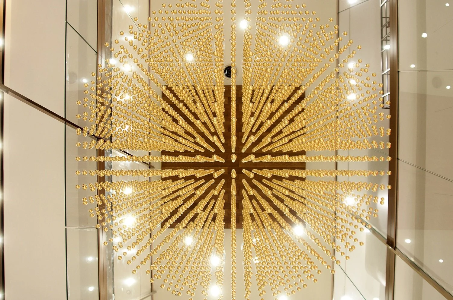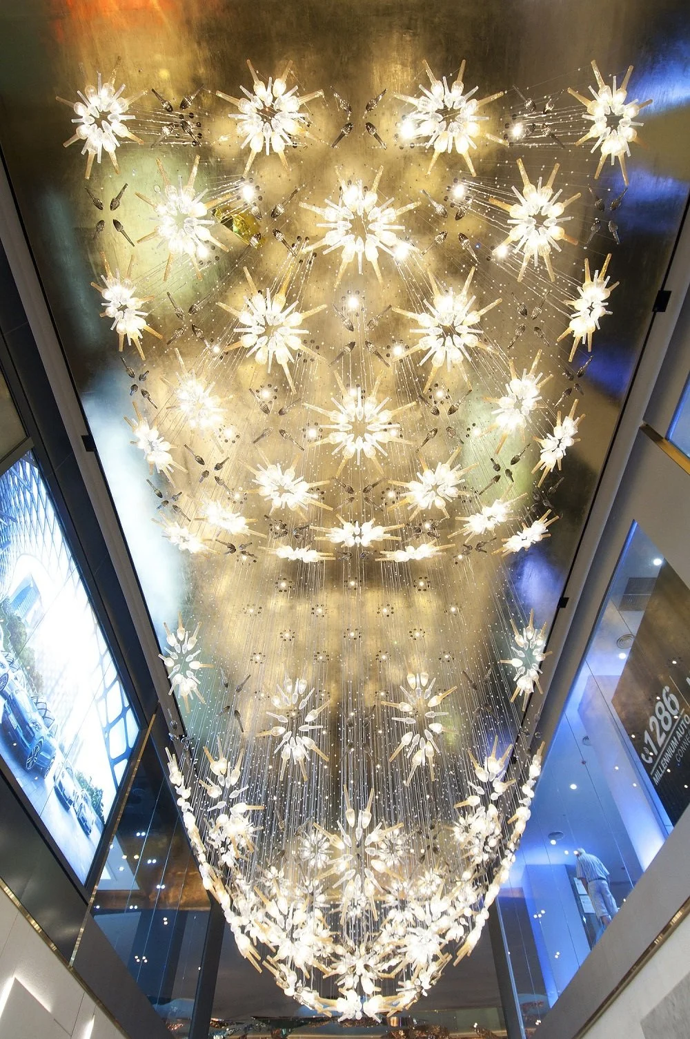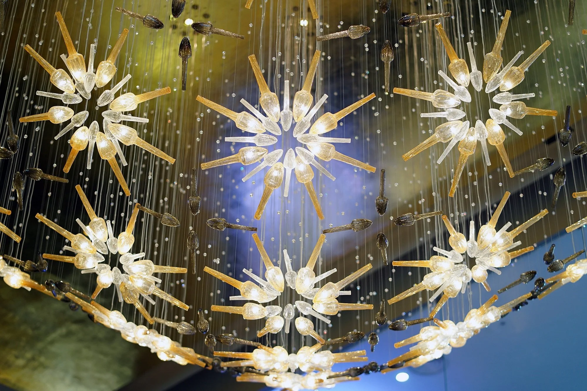 หลังจากชมประติมากรรมไปเรียบร้อยแล้ว บนเพดานระหว่างโถงทางเดินอาคารที่เชื่อมต่อระหว่างไอคอนสยามและโซน ICONLUXE ยังประดับด้วยแชนเดอเลียแก้วแสนพิเศษขนาดใหญ่ชิ้นเดียวในโลก ที่ออกแบบโดย Petra Junová ดีไซเนอร์แห่ง LASVIT บริษัทออกแบบและผลิตจากสาธารณรัฐเช็ก จากการนำเอาเอกลักษณ์ของคนไทยที่หลายชาติต่างกล่าวขานเป็นเสียงเดียวถึงความโอบอ้อมอารีของคนไทยจนกลายมาเป็นที่มาของคำว่า “รอยยิ้มเมืองสยาม” ที่เลื่องลือไปทั่วโลก มาเป็นแรงบันดาลใจในการออกแบบแชนเดอเลียจาก “พวงมาลัย” ที่ร้อยด้วยดอกรักและดอกมะลิ ซึ่งเป็นลักลักษณ์แทนน้ำใจ ราวกับเป็นการต้อนรับผู้มาเยือนไอคอนสยามด้วยรอยยิ้มที่แสนอบอุ่นแบบไทย