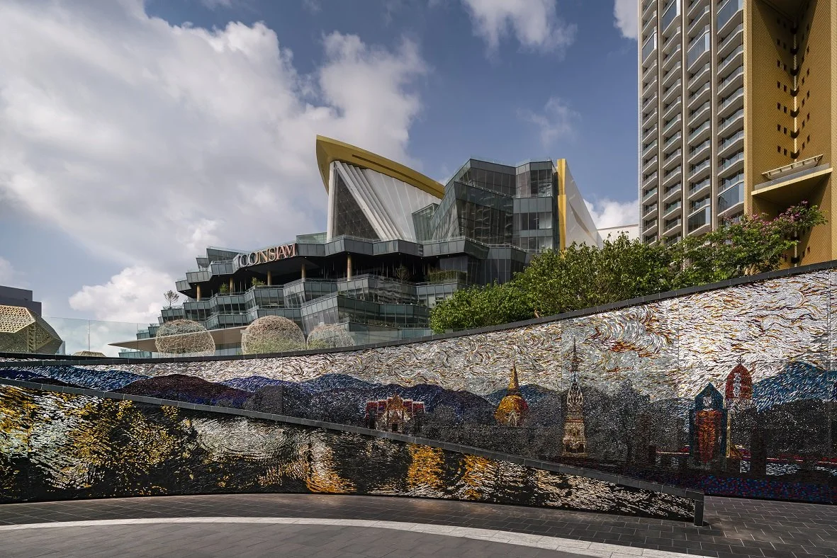 ในฐานะพื้นที่แห่ง Public Art Space แน่นอนว่าไอคอนสยาม ไม่เพียงแต่รวบรวมงานศิลป์ไว้ภายในเท่านั้น แต่ยังรวมไปถึงองค์ประกอบภายนอกด้วยเช่นกัน โดยไฮไลท์อยู่ที่ ICONSIAM Park ชั้น 2 กับกำแพงศิลป์ “แสงสยาม” Art Wall ขนาดใหญ่ที่ทอดยาว 60 เมตร ที่คุณสิทธิ์วุธ ยาวิชัย ศิลปินรุ่นใหม่ได้หยิบยกเอา “กระจกสี” หนึ่งในงานของช่างสิบหมู่ของไทย งานพุทธศิลป์ที่หาดูได้ยากในปัจจุบัน มาสร้างสรรค์ผลงานสไตล์อิมเพรสชันนิสม์ด้วยเทคนิคร่วมสมัย โดยความโดดเด่นของกำแพงศิลป์นี้อยู่ที่แสงเงาธรรมชาติที่สะท้อนเปลี่ยนไปแต่ละช่วงเวลา ถือเป็นเสน่ห์ที่ประทับลงบนความรู้สึกซึ่งแตกต่างกันไปผ่านสายตาของผู้ชมในแต่ละช่วงเวลา