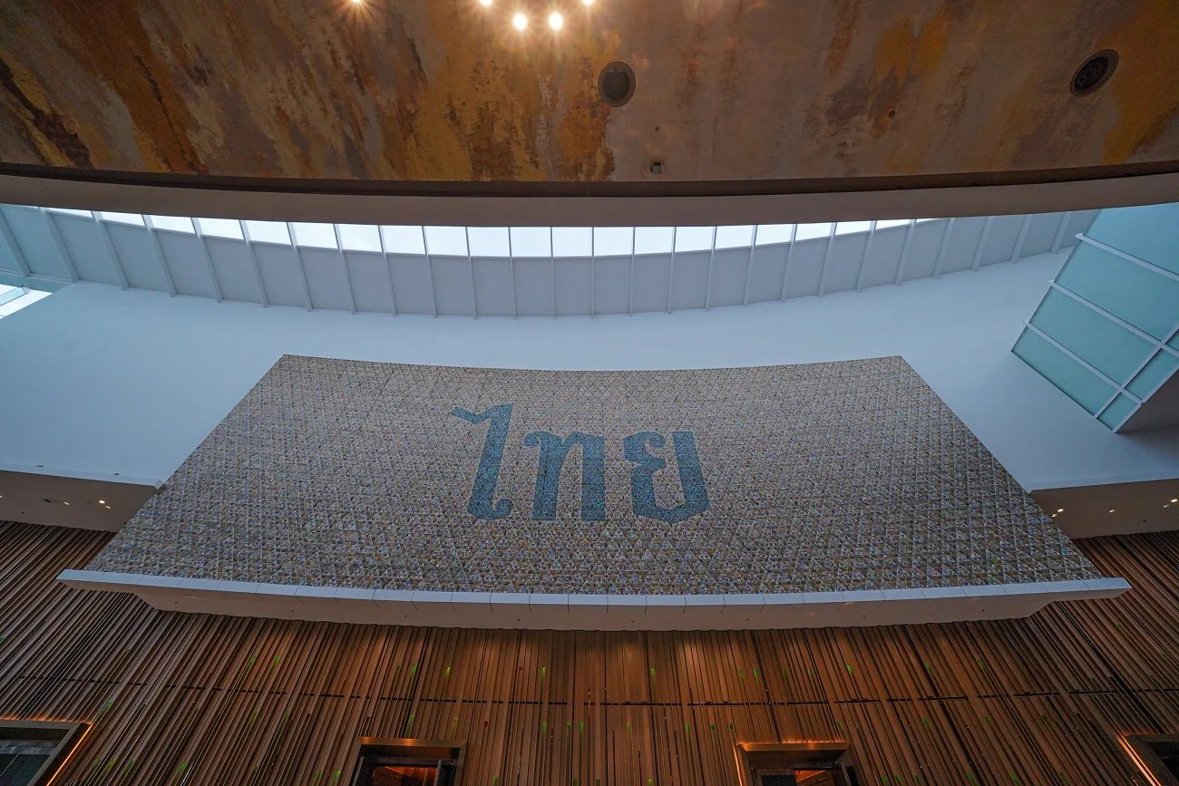 จบท้ายการสำรวจงานศิลป์สุดไอคอนนิกด้วยผลงานเทคนิคคอลลาจ (Collage) “รวมพลังความเป็นไทย” ณ บริเวณสุราลัย ฮอลล์ชั้น 7 รังสรรค์โดยผู้ช่วยศาสตราจารย์ประทีป สุธาทองไทย ผู้มีชื่อเสียงด้านศิลปะภาพพิมพ์และ Photo Collage ระดับแถวหน้า โดยงานชิ้นดังกล่าว เปรียบเสมือนแลนดิ้งปิดท้ายทริปชมงานศิลป์อย่างสมบูรณ์แบบ ผ่านภาพที่รวบรวมทุกมิติของความเป็นไทยในแง่มุมต่างๆ ที่รวบรวมองค์ประกอบของไอคอนสยามที่แฝงเอกลักษณ์ของไทย พร้อมภาพจากผู้คนที่บอกเล่าถึงวัฒนธรรมที่ดีงามของประเทศในมิติต่างๆ กว่า 35,000 ภาพ มารวมหลอมไว้เป็นภาพขนาดใหญ่ยักษ์ 10 x 27 เมตร จารึกด้วยคำว่า ‘ไทย’ คำสั้นๆ แต่มีความหมายอันทรงพลังอยู่ตรงกลาง โดยใช้ฟ้อนต์ที่ให้ความรู้สึกถึงการบรรจบกันระหว่างความเก่าแก่และสมัยใหม่ พร้อมใช้แพตเทิร์นที่ได้แรงบันดาลใจจาก “ลายผ้าไทย” ด้วยดีไซน์ที่สื่อถึงความโมเดิร์นและไทยดั้งเดิม