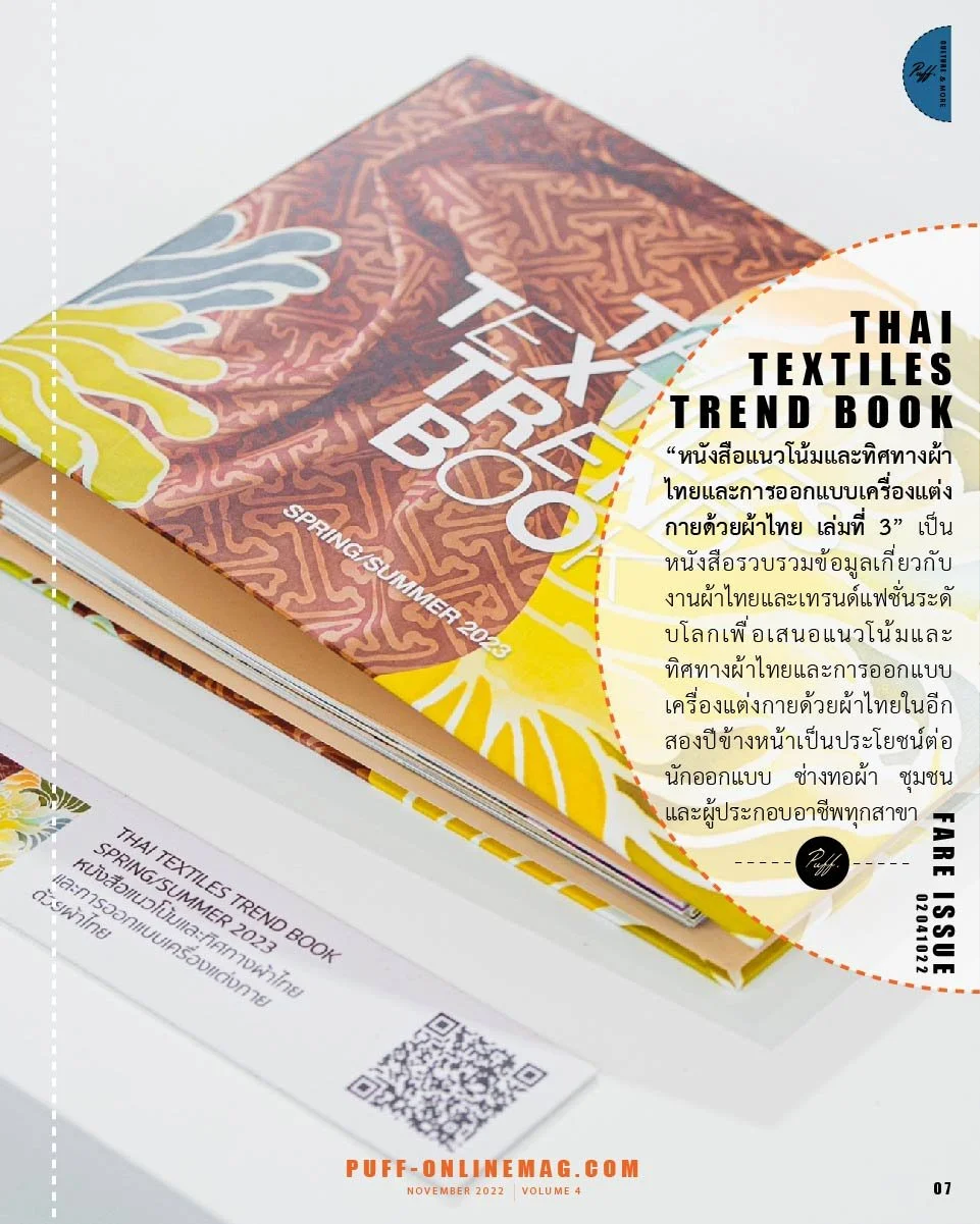 สำหรับวัตถุประสงค์ของการจัดทำหนังสือ Thai Textiles Trend Book เป็นการรวบรวมข้อมูลเกี่ยวกับงานผ้าไทยและเทรนด์แฟชั่นระดับโลก เพื่อเสนอแนวโน้มและทิศทางผ้าไทยและการออกแบบเครื่องแต่งกายด้วยผ้าไทย เพื่อเป็นประโยชน์ต่อนักออกแบบ ช่างทอผ้า ชุมชน และผู้ประกอบอาชีพทุกสาขา โดยหนังสือ Thai Textiles Trend Book Spring/Summer 2023 เล่มล่าสุด นำเสนอแนวคิด “วัฒนธรรมอันเคลื่อนคล้อย” (Moving Culture) การเคลื่อนที่ทางวัฒนธรรม และการแลกเปลี่ยนเอกลักษณ์ ของแต่ละถิ่นฐานบนผืนผ้า ซึ่งได้แรงบันดาลใจของบรรยากาศฤดูร้อนของไทย โดยทำการศึกษาควบคู่ไปกับงานภูมิปัญญา และงานหัตถศิลป์ สะท้อนแนวคิด ผ้าไทยหลายชนิด ที่มีที่มาจากวัฒนธรรมอื่นๆ ซึ่งแสดงให้เห็นถึงธรรมชาติของวัฒนธรรมที่ไม่ตายตัว แต่มีการปรับตัวและแลกเปลี่ยนของอัตลักษณประจำถิ่นเกิดขึ้นอย่างช้าๆ และต่อเนื่อง โดยมีผ้าไทยประจำฤดูกาลนี้อย่าง “ผ้าขาวม้า” และ “ผ้าบาติก” เป็นตัวอย่างของการแลกเปลี่ยนทางวัฒนธรรมที่เกิดขึ้นทั้งในไทยและภูมิภาคเอเชียตะวันออกเฉียงใต้
