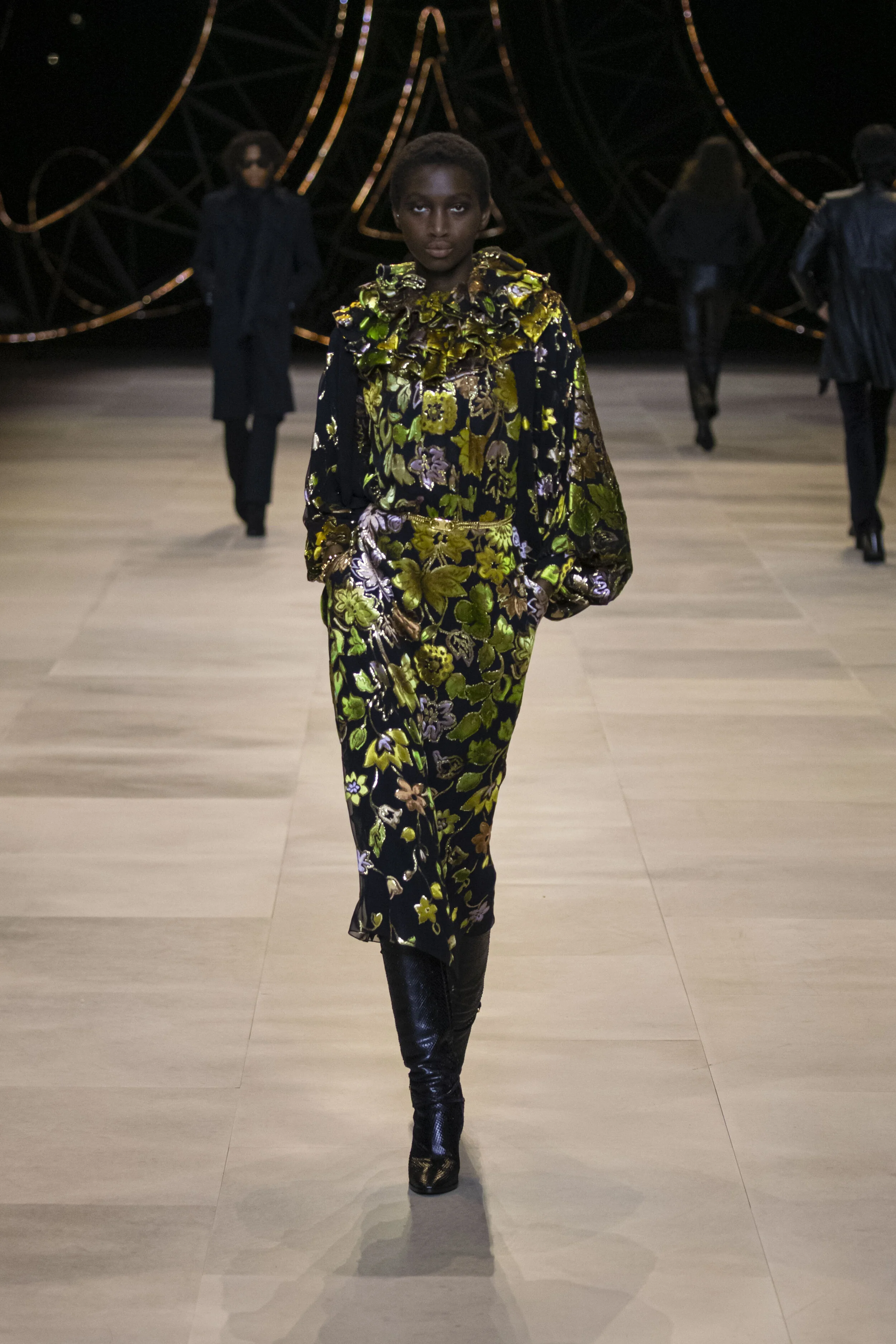 นอกจากผ้ากำมะหยี่อันเป็นหัวใจหลักในการสร้างสรรค์เสื้อผ้าในคอลเลคชั่นนี้ อันจะเห็นได้จากชุดกระโปรง กางเกง และสูทแจ็กเก็ตบนเรือนร่างของนางแบบหญิงแล้ว ยังมีชุดกระโปรง กางเกงทรงฮาเร็ม ที่ใช้ผ้าลูเร็กซ์ และผ้าลาเม่ในเฉดสีเมทัลลิคมาใช้สร้างสรรค์ และการปักประดับสร้างลวดลายที่หรูหราด้วยเลื่อมและดิ้นทอง การใช้ขนสัตว์ และลวดลายเสือดาวอีกด้วย อีกสิ่งหนึ่งที่นำมาจากงานต้นแบบของเซลีน