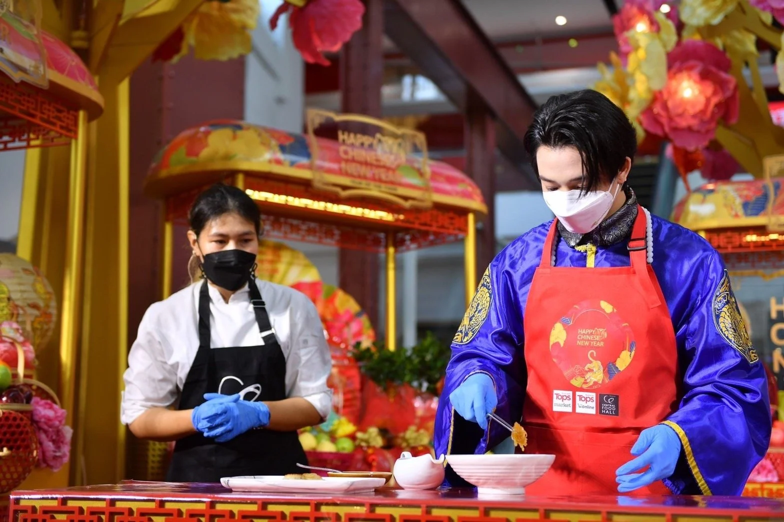 เมื่อหนุ่มบาส ปรากฎตัวพร้อมเสียงกรี๊ดจากบรรดาแฟนคลับที่บ่นคิดถึง หนุ่มน้อยหน้าใสก็แจกรอยยิ้มหวาน ๆ ภายใต้หน้ากากพร้อมเริ่มต้นกิจกรรมด้วยการสุ่มจับฉลากหาผู้โชคดี ที่มาร่วมกิจกรรมทำเมนูมงคลรับตรุษจีนปีเสือทอง “Auspicious Gold Dumpling หรือ ถ้วยทองมงคล” ที่เชื่อกันว่าหากได้ทานในช่วงตรุษจีนจะโชคดีตลอดปี โดยเป็นเมนูที่ดัดแปลงมาจากเมนูพาสต้า Cappelletti ห่อแป้งให้คล้ายกับเหรียญ ไส้ข้างในจะเลือกสรรอาหารที่มีความหมายเพื่อความเป็นมงคล ได้แก่ ปู หมายถึง ความยิ่งใหญ่ ก้าวหน้า กุ้ง หมายถึง ยศ ตำแหน่ง เสริมด้วยวุ้นเส้นที่มีความหมายว่ายืนยาว