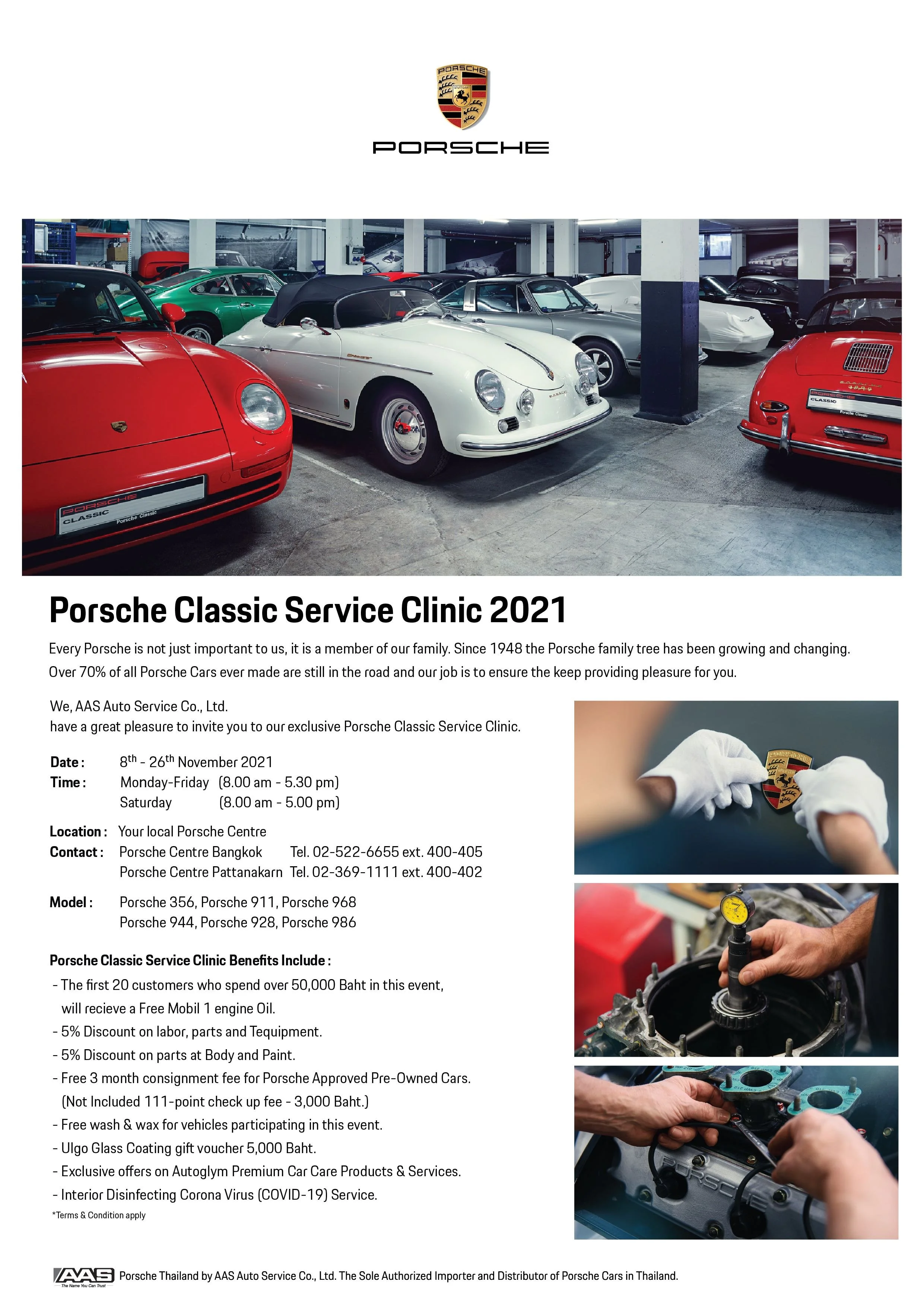 บริษัท เอเอเอส ออโต้ เซอร์วิส จำกัด (AAS) ผู้นำเข้าและตัวแทนจำหน่ายรถยนต์ปอร์เช่อย่างเป็นทางการแต่เพียงผู้เดียวในประเทศไทย ชวนคนรักรถคลาสสิคร่วมแคมเปญ Porsche Classic Service Clinic 2021 ตรวจเช็คและดูแลรถยนต์ปอร์เช่รุ่นคลาสสิค ด้วยช่างผู้ชำนาญการที่ผ่านการฝึกอบรมและรับรองมาตรฐานระดับเหรียญทอง พร้อมคัดสรรอะไหล่แท้ จากโรงงานปอร์เช่ ประเทศเยอรมนี ความพิเศษแบบนี้สำหรับลูกค้าท่านเจ้าของรถยนต์ปอร์เช่รุ่นคลาสสิค รุ่น ปอร์เช่ 356, 914, 959, 911 , 930, 964, 993 ,996 รวมไปถึงปอร์เช่รุ่น 924, 944, 968 และ 928 และปอร์เช่ บ็อกซเตอร์ 986 ความพิเศษแบบนี้ยังมาพร้อมโปรโมชั่นทั้งลดทั้งรับเพิ่มถูกใจคอรถหรูอย่างแน่นอน