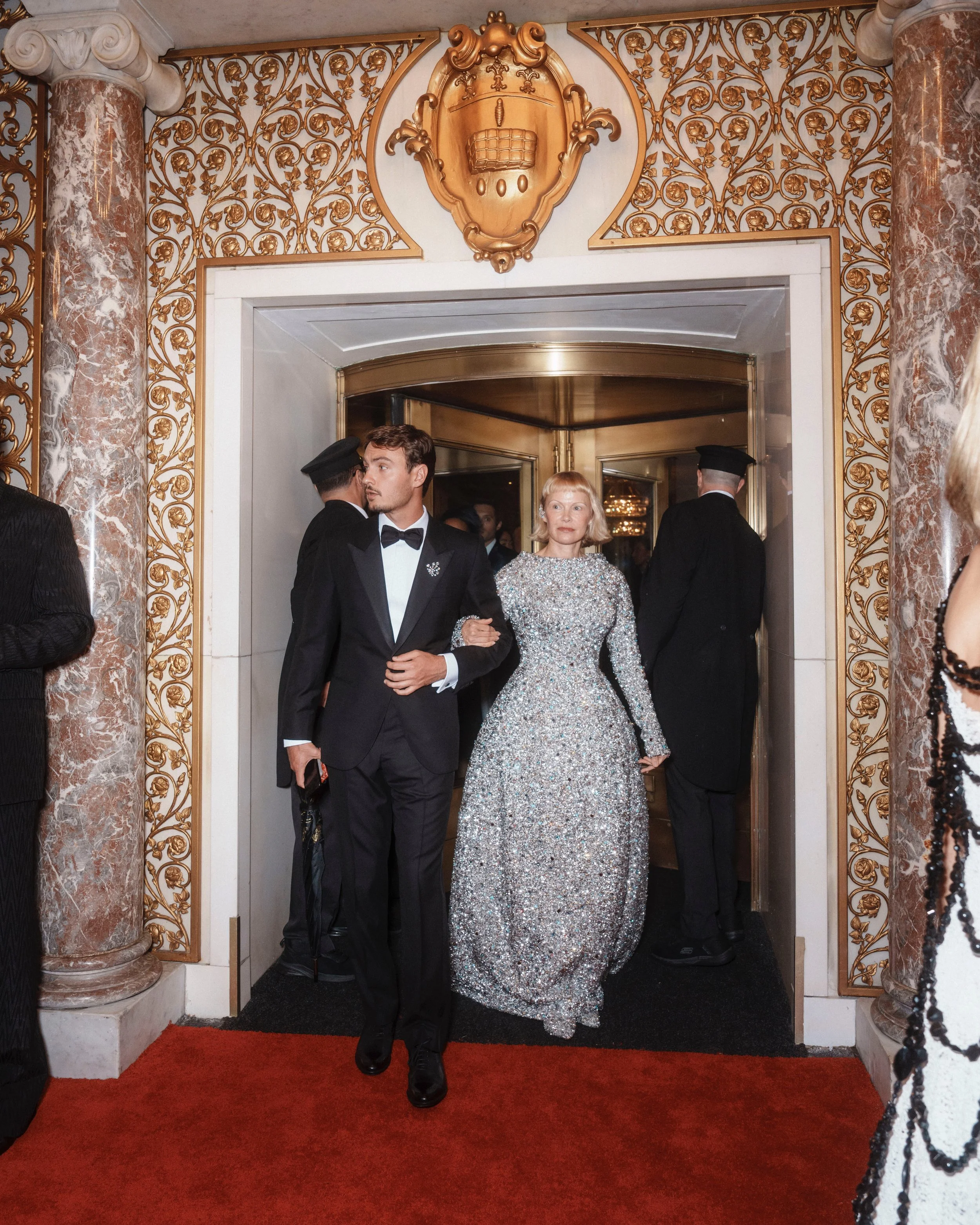 ผู้กำกับหญิง Janicza Bravo สวมชุดที่ออกแบบร่วมกับศิลปิน Rashid Johnson โดยใช้ผลงานของเขาที่จัดแสดงอยู่ใน Rashid Johnson: A Poem for Deep Thinkers ณ Guggenheim เป็นจุดเริ่มต้น แจ็กเก็ต silk-cotton ประดับใบหน้าจากผลงาน “Untitled, Anxious Audience” (2019) ด้วยเลื่อมจิ๋ว งานปัก และลูกปัดแคฟิอาร์ กระโปรงชั้นในได้แรงบันดาลใจจาก “Body and Soul” (2021) ถ่ายทอดเป็นลายปักที่ดูรุนแรงด้วยกำมะหยี่ขรุขระและฟอยล์ทาสีมือ ส่วนกระโปรงชั้นนอกมีลวดลายเรือจาก “Heartbreaker” (2022) ในซีรีส์ Seascape งานที่พูดถึงการเอาตัวรอด อิสรภาพ และการหลบหนี
