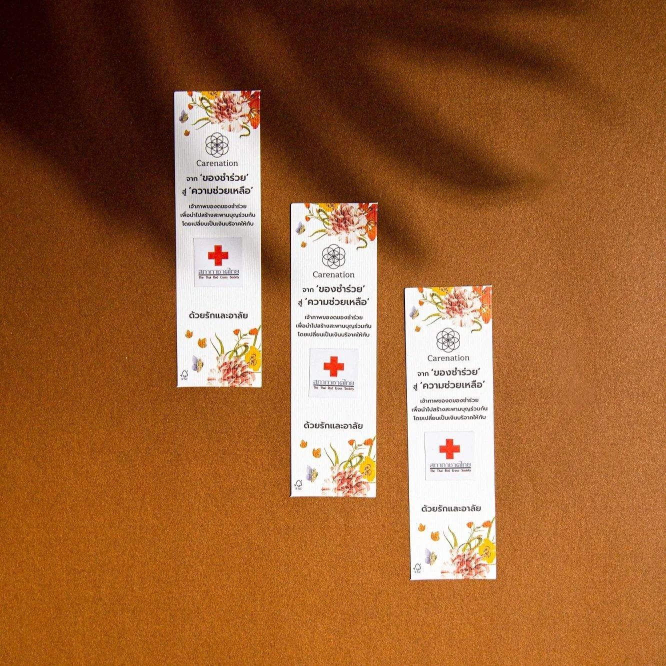 “การ์ดสานบุญ” ของชำร่วยจาก แคร์เนชั่น ที่ตั้งเป้าหมายช่วยเหลือสังคมได้อย่างยั่งยืน เพื่อคืน 3 ส่วนให้แก่ผู้บริโภค ได้แก่ “คืนบุญ ด้วยการเลือกมูลนิธิส่งต่อความช่วยเหลือ - คืนส่วนลด มีใบเสร็จใช้ลดหย่อนภาษีให้ - คืนสิ่งแวดล้อม ลดมลภาวะด้วยกระดาษผลิตจากป่าปลูกหมุนเวียน