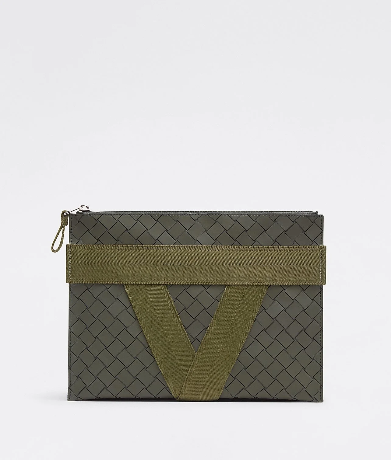 รูปแบบที่คุ้นเคยของกระเป๋าใส่เอกสารสุดคลาสสิคหรือ Document Case ของผู้ชายจาก Bottega Veneta คอลเลคชั่น Wardrobe 01 โดยครั้งนี้ถูกนำมาสร้างสรรค์ขึ้นโดยการใช้เทคนิค Rubber Intrecciato เพิ่มสัญลักษณ์ลวดลาย ตัว 'V' ที่ด้านนอกของกระเป๋า เสริมลูกเล่นที่ทันสมัยและสะดุดตาด้วยสีเขียว Camping และสีแดง Tomato