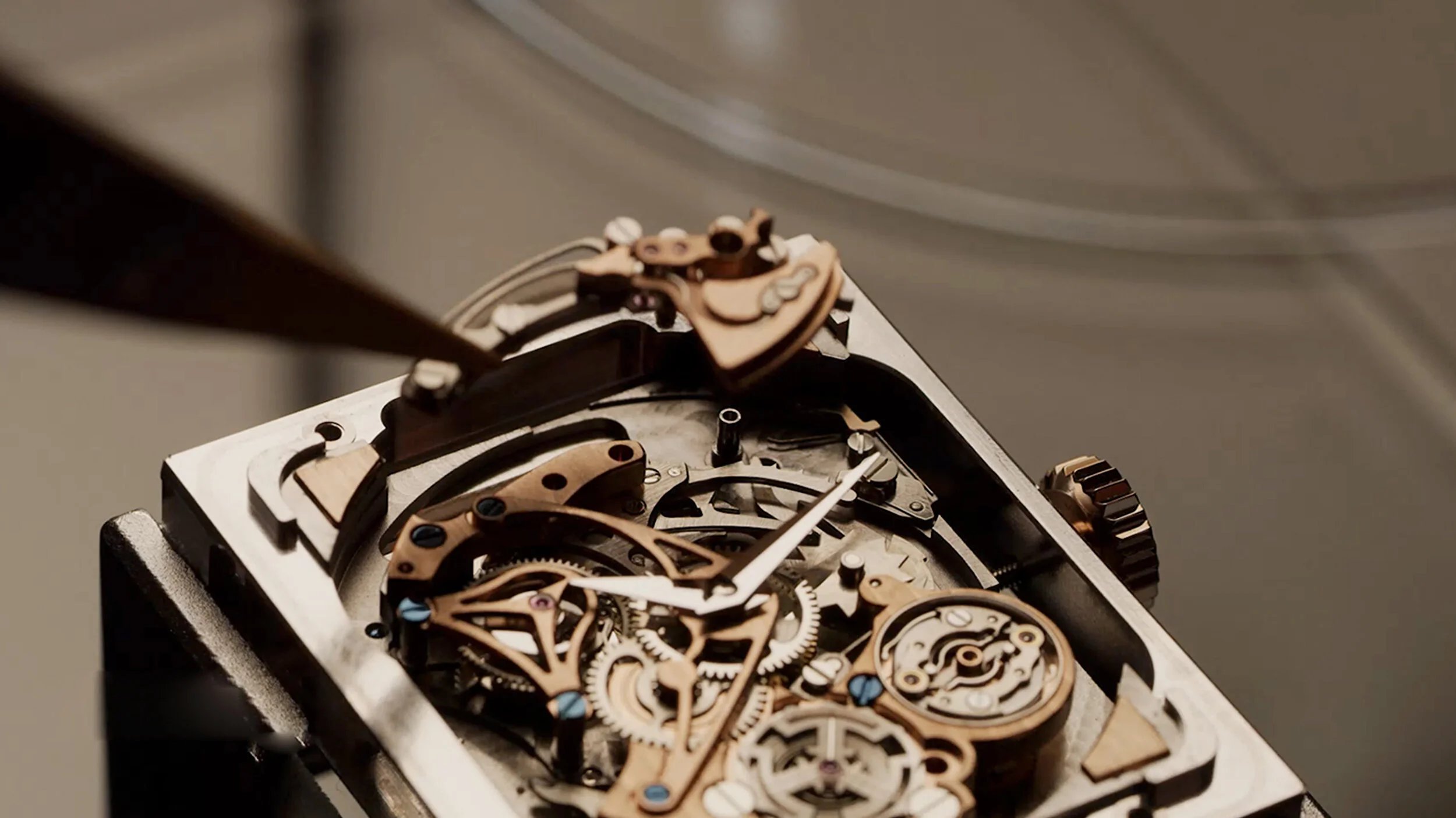 The front dial is entirely skeletonised, revealing the full complexity of the minute repeater mechanism and presenting a mesmerising display of moving parts when the minute repeater is activated. Beneath a large bow-shaped bridge, the components appear almost to be floating in three dimensions.