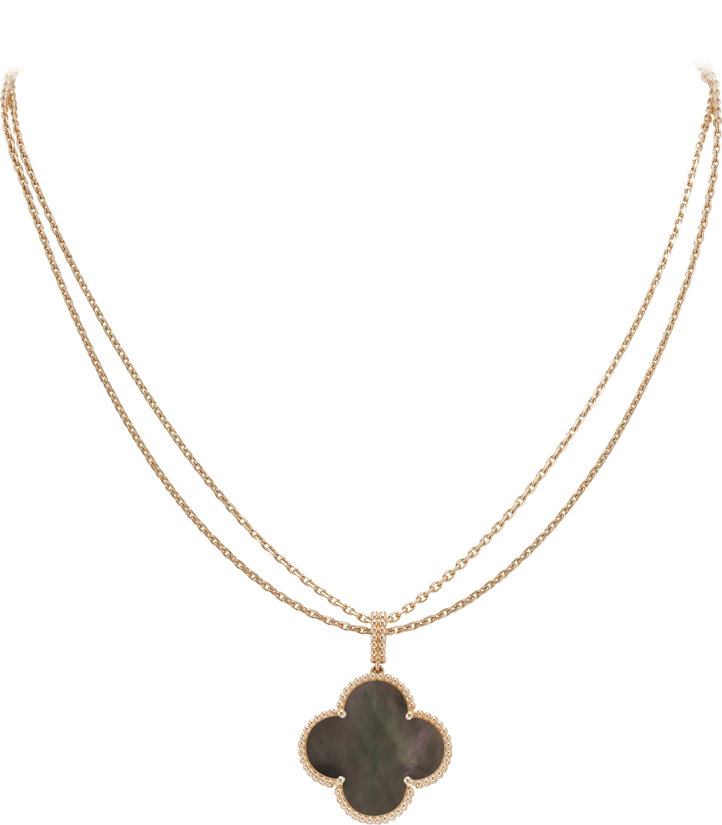 สร้อยคอยาว Magic Alhambra รุ่นใหม่ทั้งสี่สไตล์ ต่างเติมเต็มความครบครันให้แก่คอลเลคชั่นเครื่องประดับอัลลองบราด้วยการร้อยจี้เดี่ยวแผ่นโมทิฟรูปทรงซึ่งเป็นที่รู้จัก และจดจำได้ในทันที ผลงานชุดนี้ยังโดดเด่นสะดุดตาจากการเลือกใช้แต่รัตนชาติเลอค่า ให้ความรู้สึกสูงส่ง เต็มไปด้วยพลังแห่งชีวิต ในขณะที่หยกพยับหมอกแกลเซโดนี (chalcedony) สีฟ้าอมเทาดูกลมกลืนกับประกายเงางามของทองคำขาว แผ่นแม่มุกเทา (mother-of-pearl) เจ้าของประกายเหลือบวาวไล่เฉดระยับเยือกเย็น กลับดูตัดกับประกายอบอุ่นละมุนละไมของทองคำสีกุหลาบ